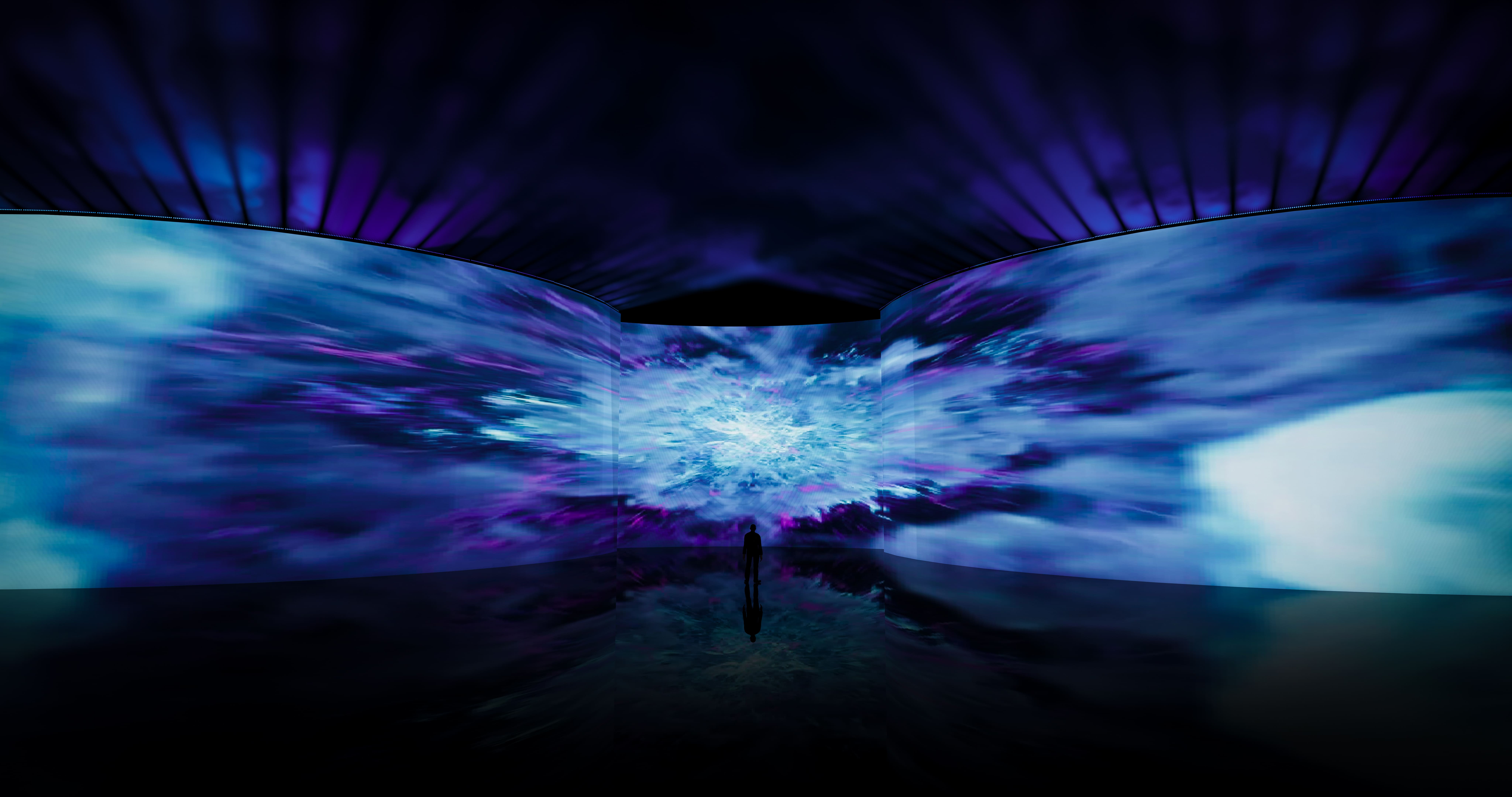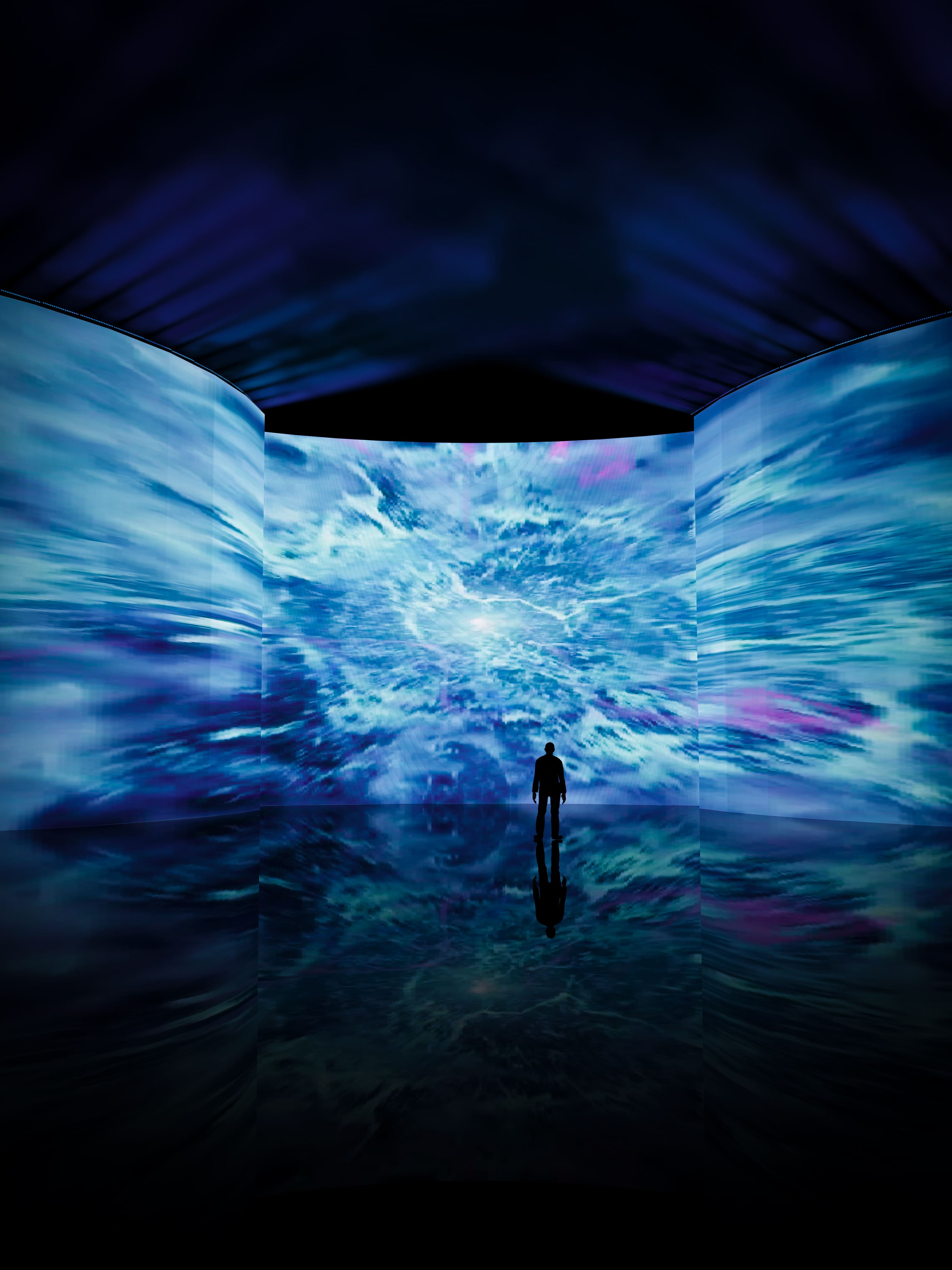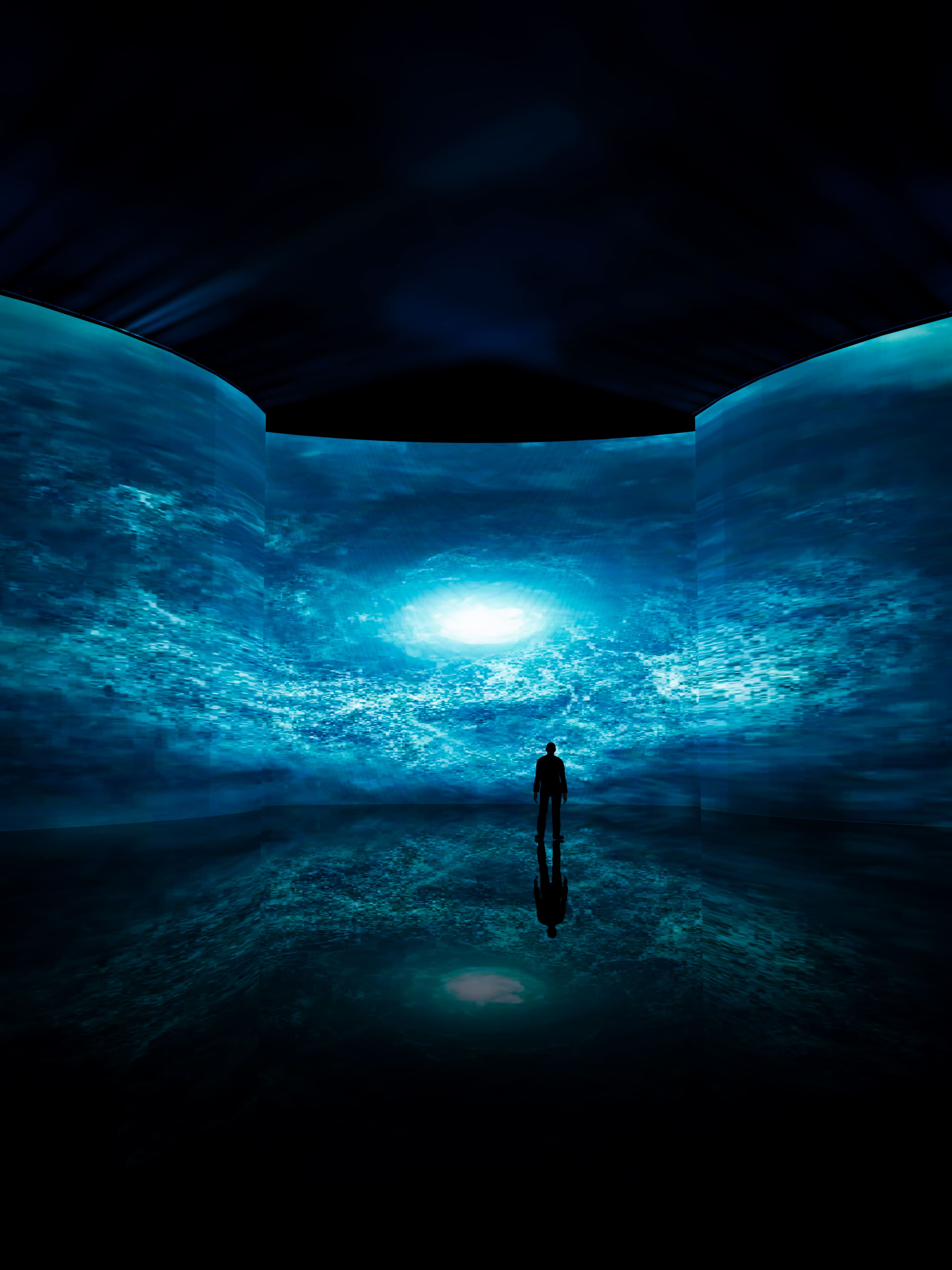 We designed an immersive concept using multiple screens arranged in semi-circular shapes, creating a surrounding effect around the artist. This setup transforms the audience’s perception through visuals that shift across different atmospheres.