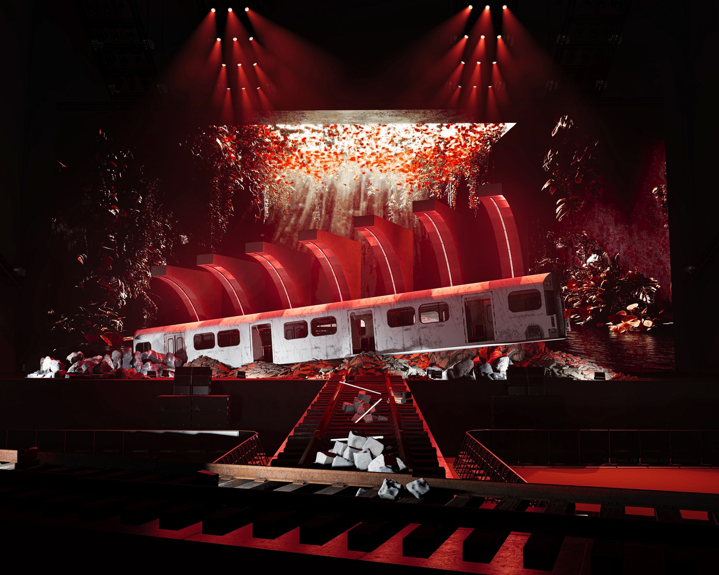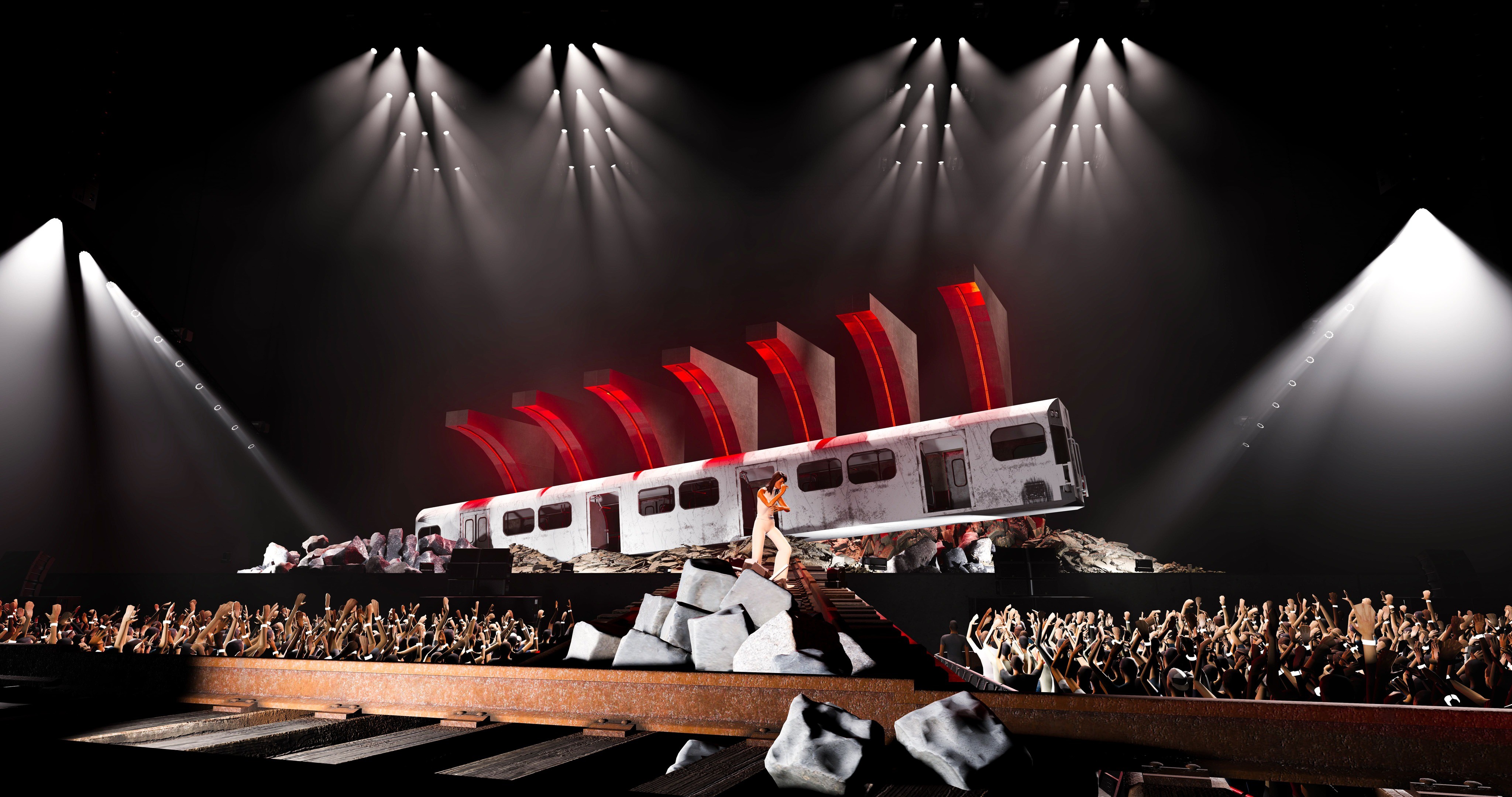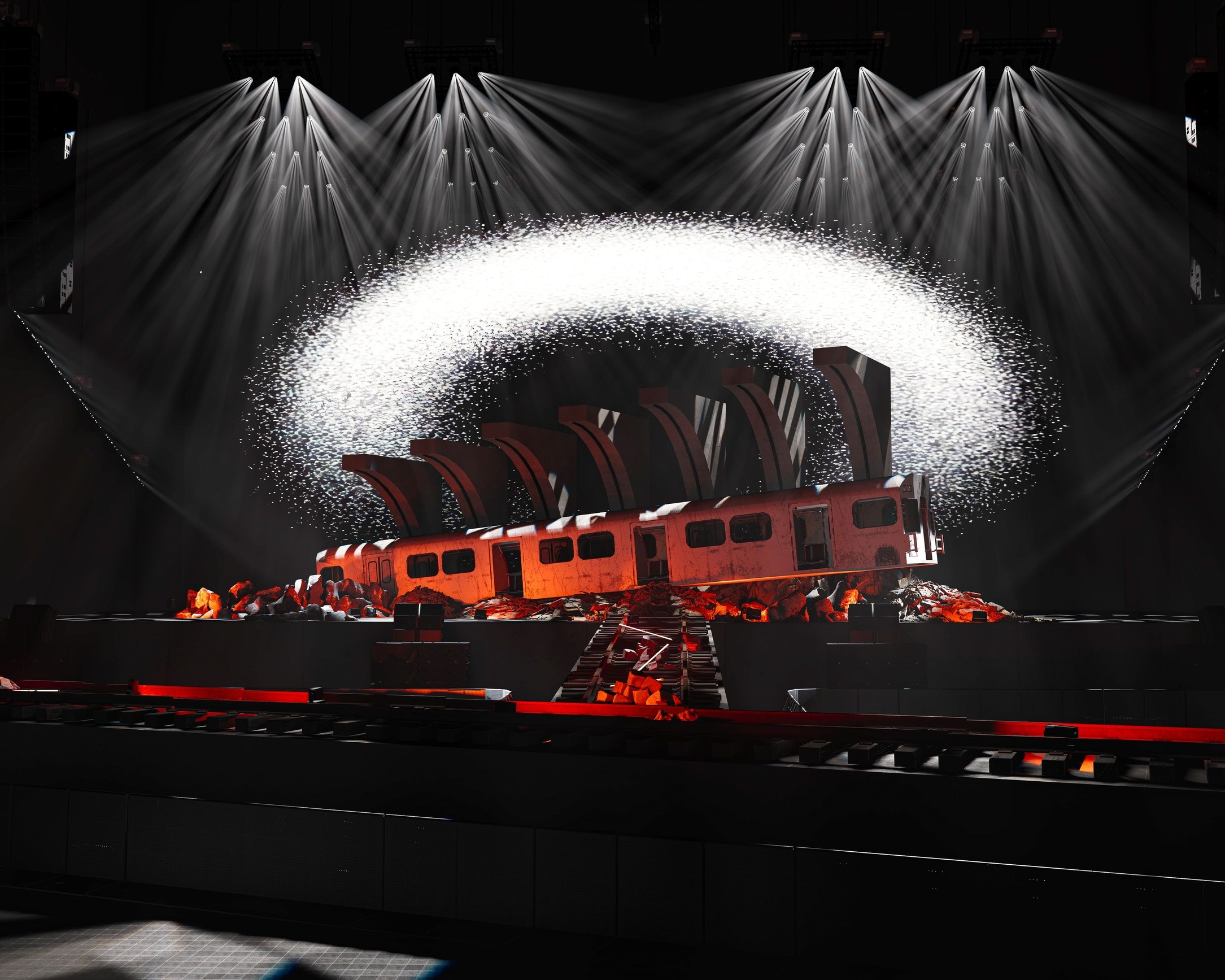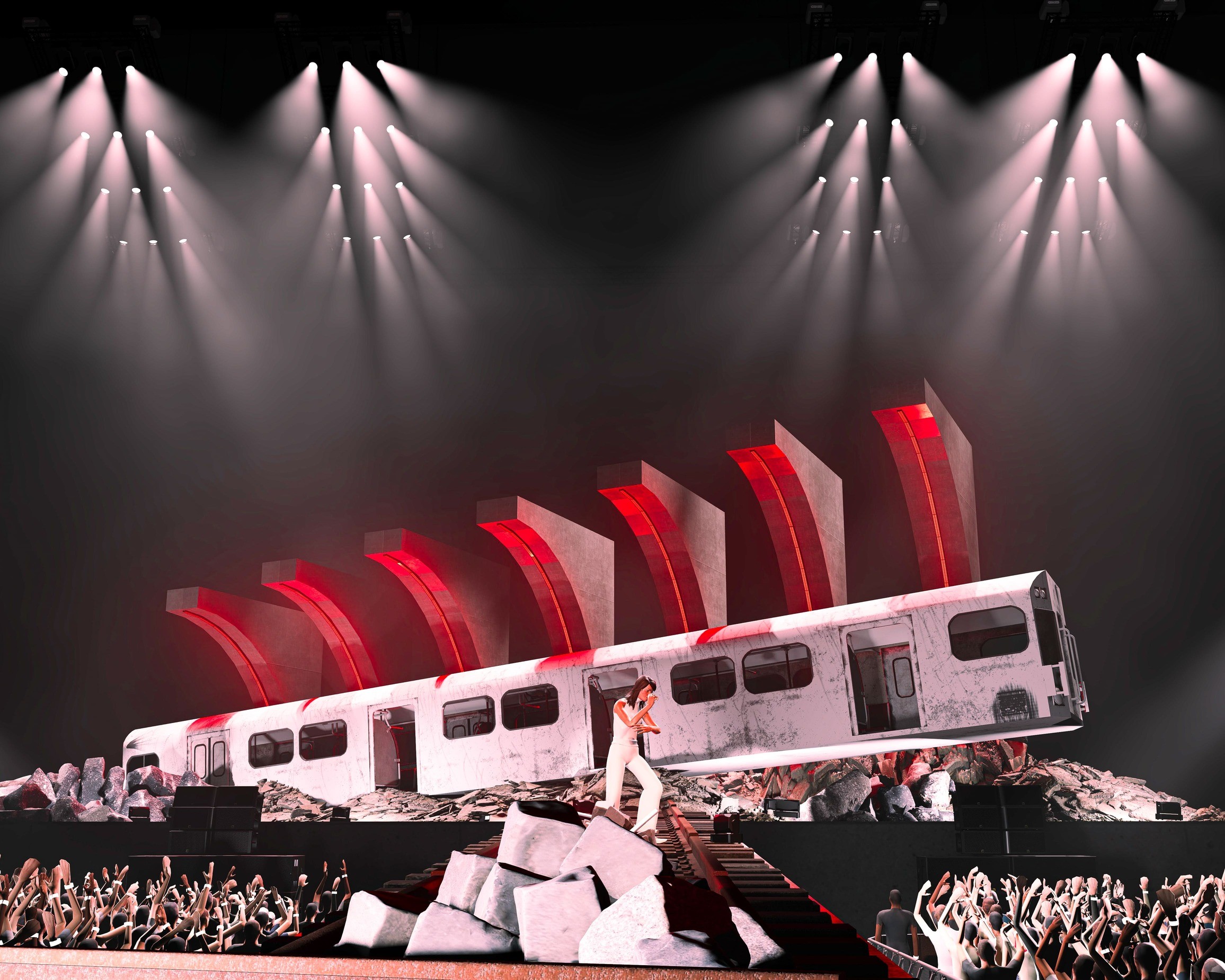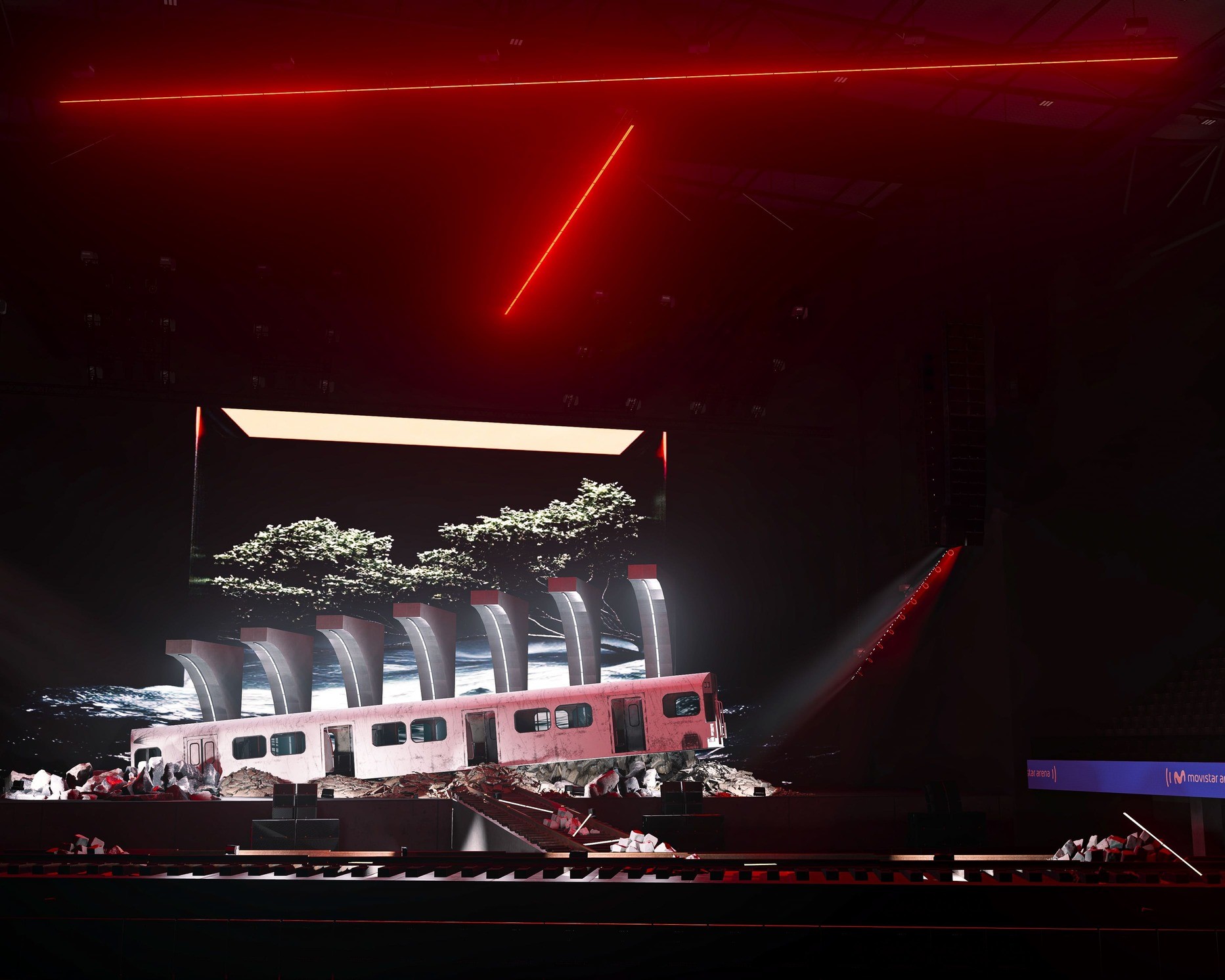 We designed the world tour show by developing an artistic concept centered on a train stopped due to an emergency. The halt symbolizes the passage of time and the need to pause and reflect. The scenography recreates an industrial tunnel with beams and rails that surround both the artist and the audience. The lighting emphasizes the tunnel’s architecture and draws vanishing lines along the rails, guiding the visual narrative song by song. A rear screen creates depth, extends the tunnel space, and amplifies the sense of movement. The result is a show with its own identity, where scenography, lighting, and visuals work together to build an immersive and cinematic experience.