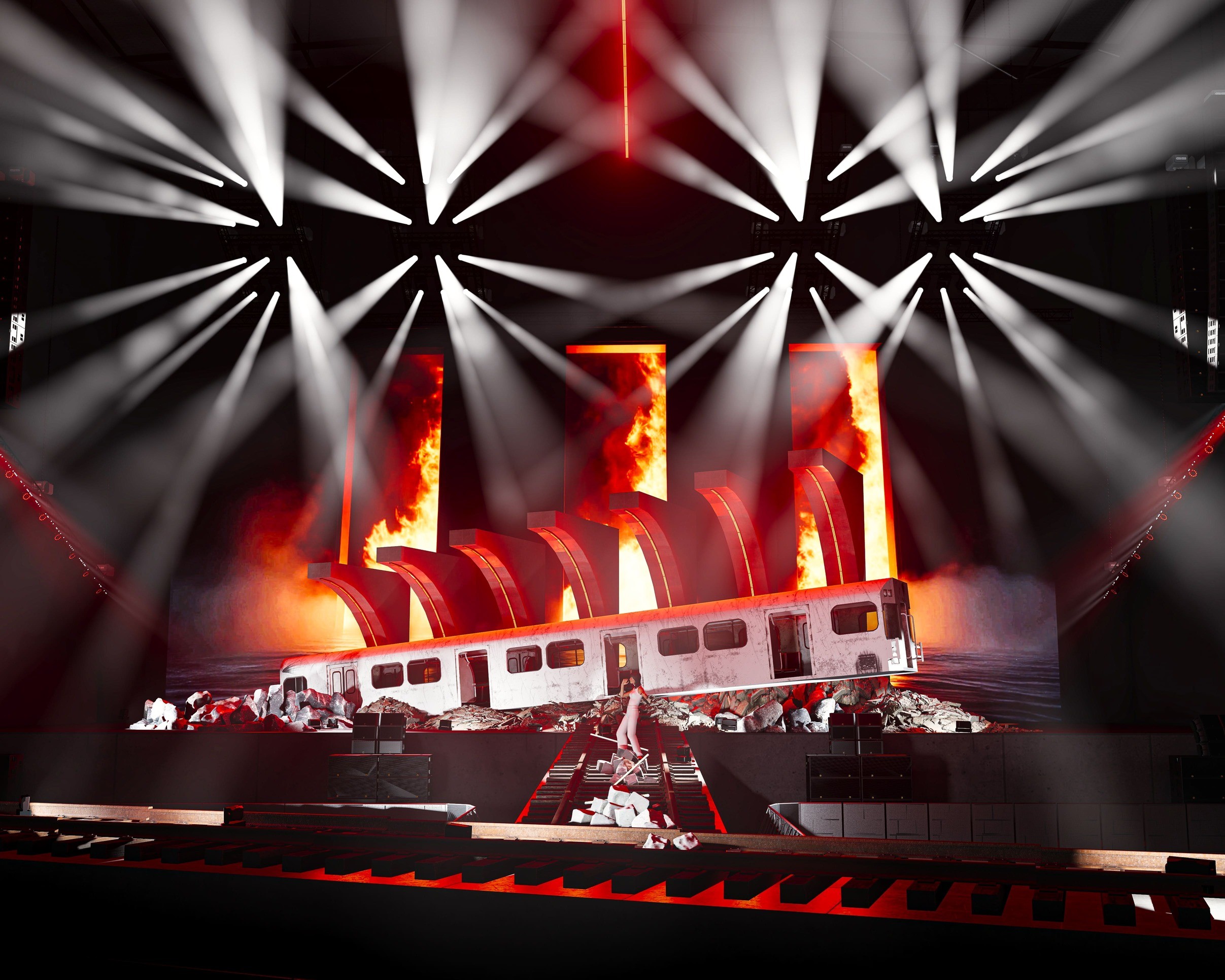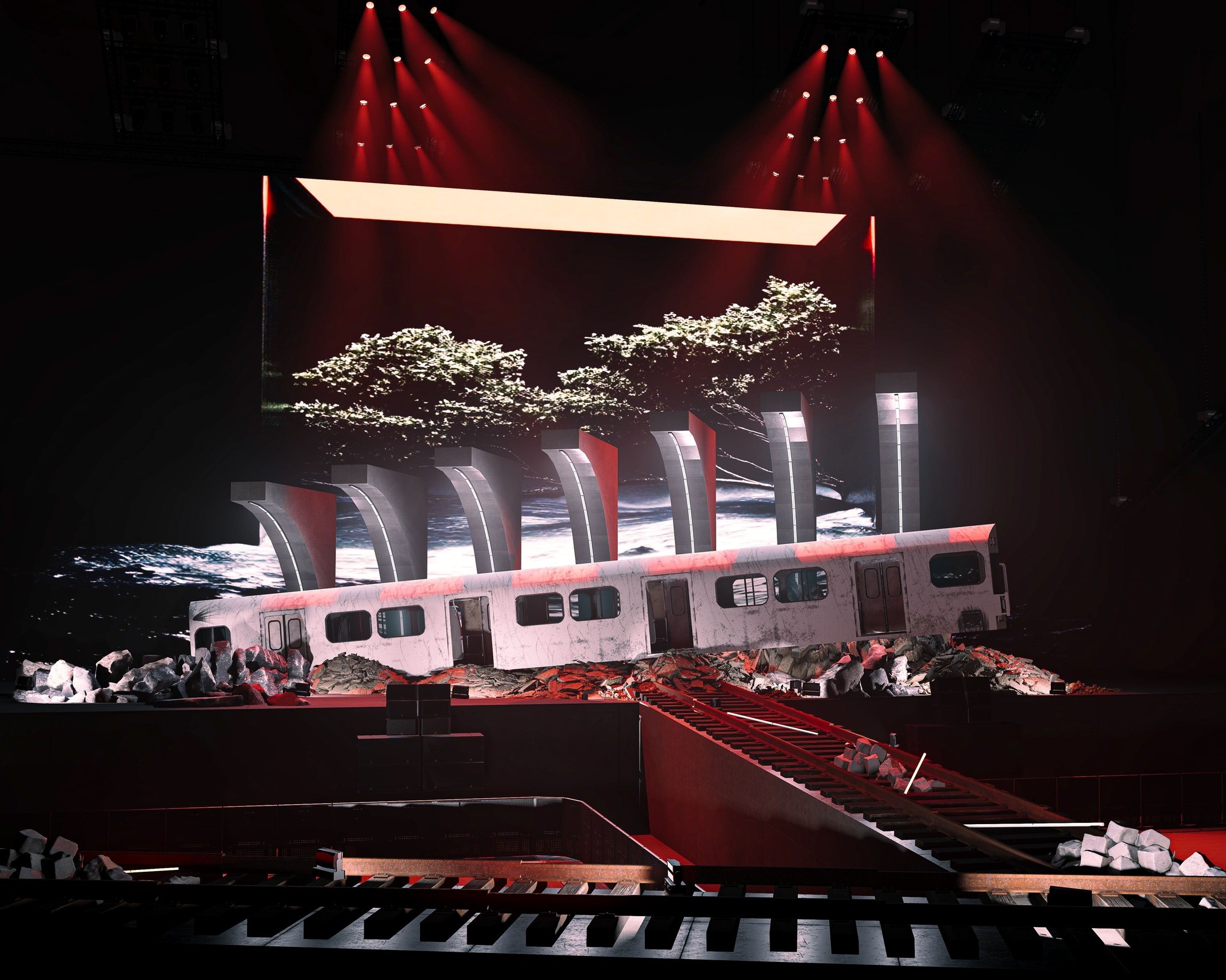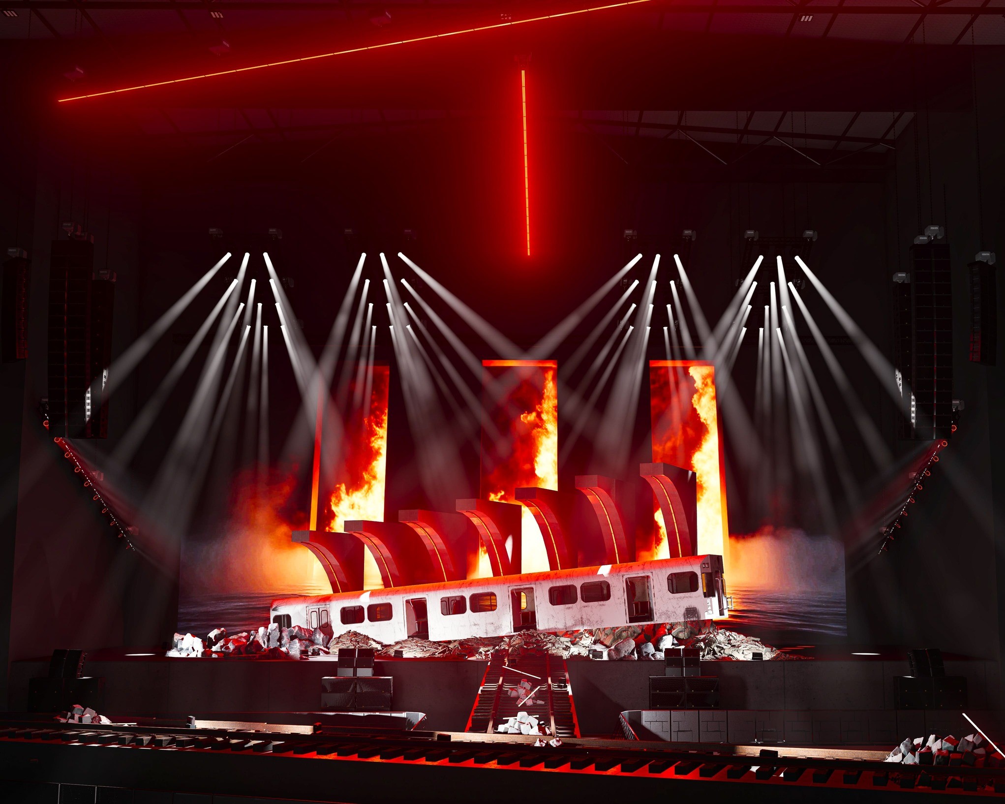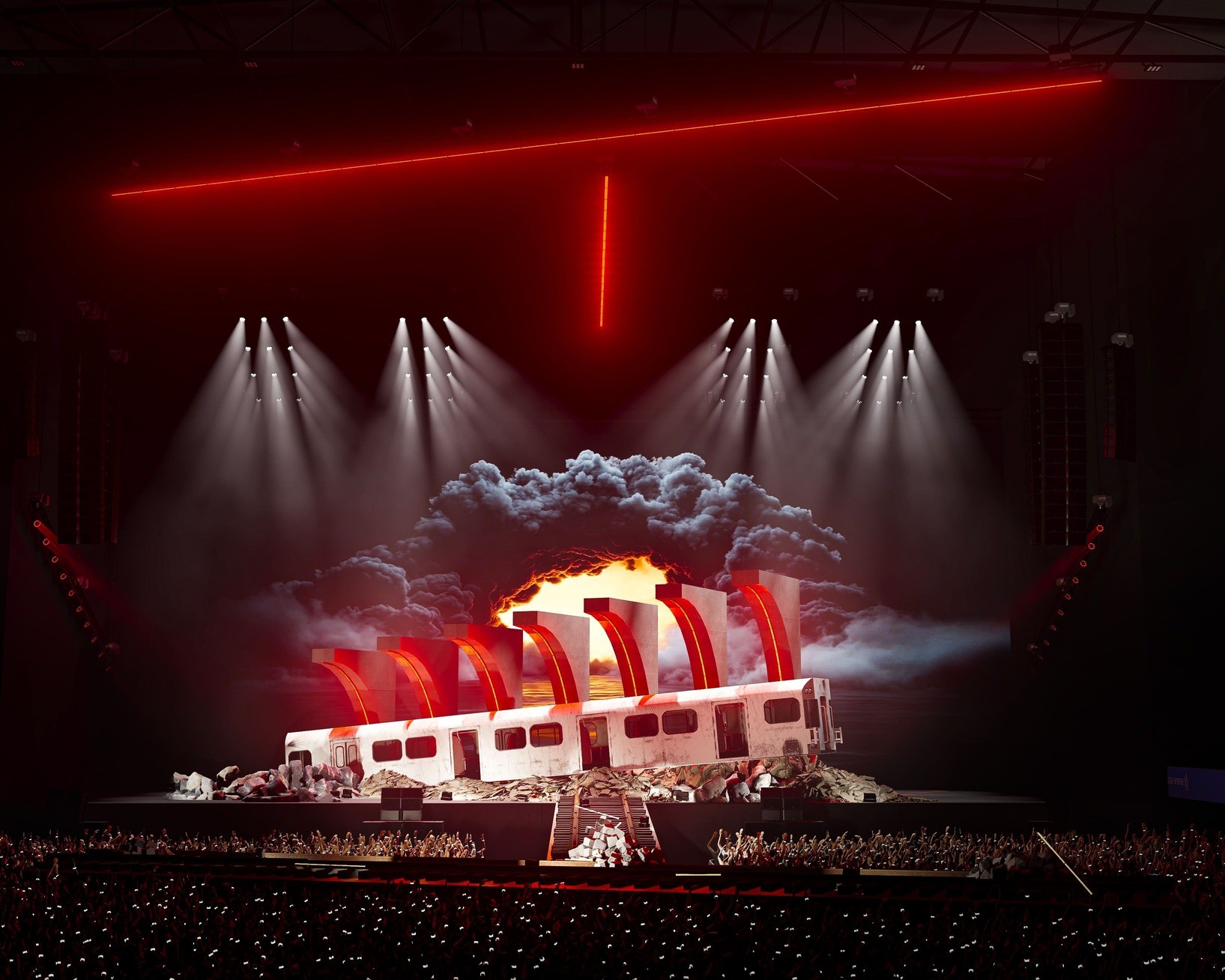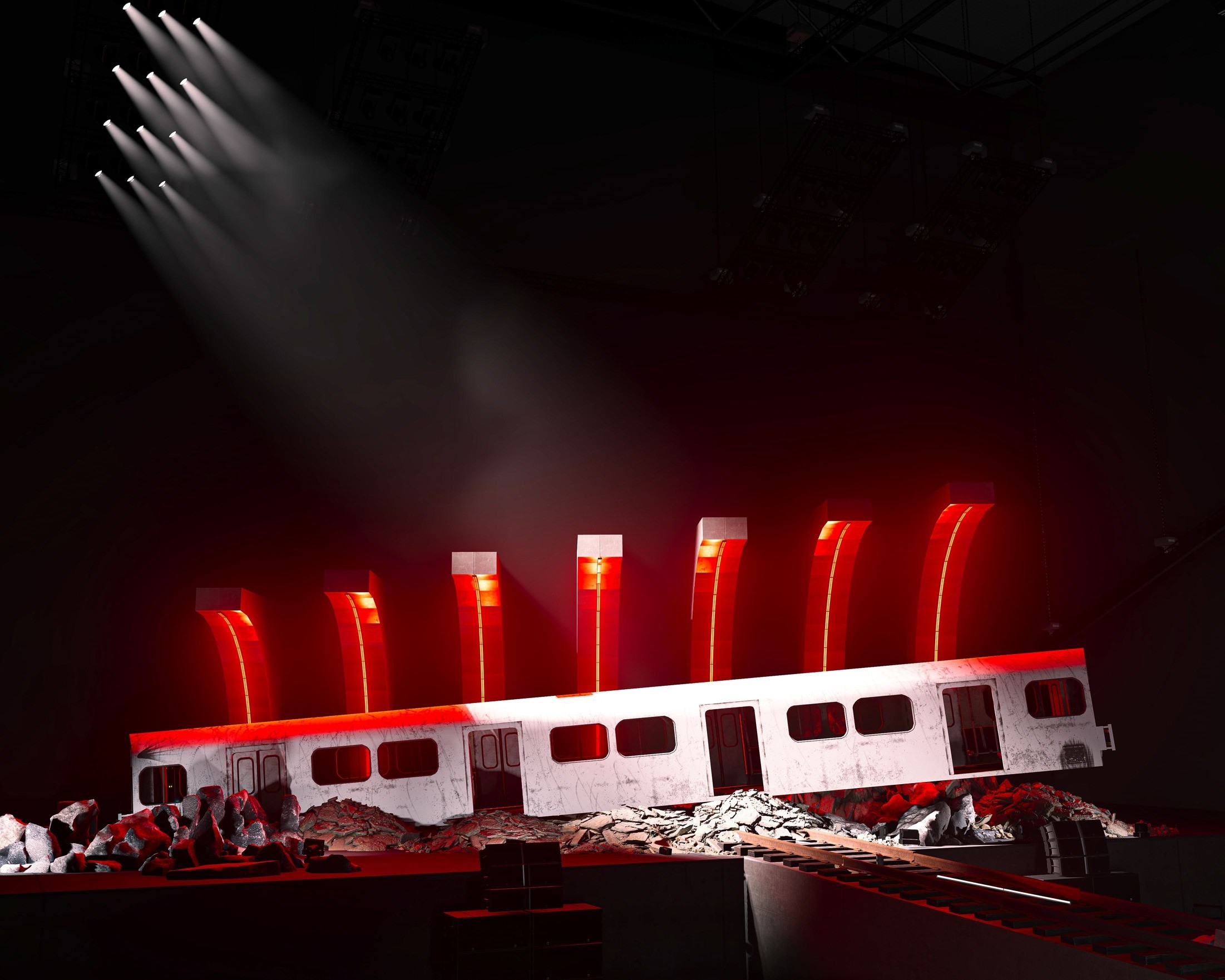 We designed the world tour show by developing an artistic concept centered on a train stopped due to an emergency. The halt symbolizes the passage of time and the need to pause and reflect. The scenography recreates an industrial tunnel with beams and rails that surround both the artist and the audience. The lighting emphasizes the tunnel’s architecture and draws vanishing lines along the rails, guiding the visual narrative song by song. A rear screen creates depth, extends the tunnel space, and amplifies the sense of movement. The result is a show with its own identity, where scenography, lighting, and visuals work together to build an immersive and cinematic experience.