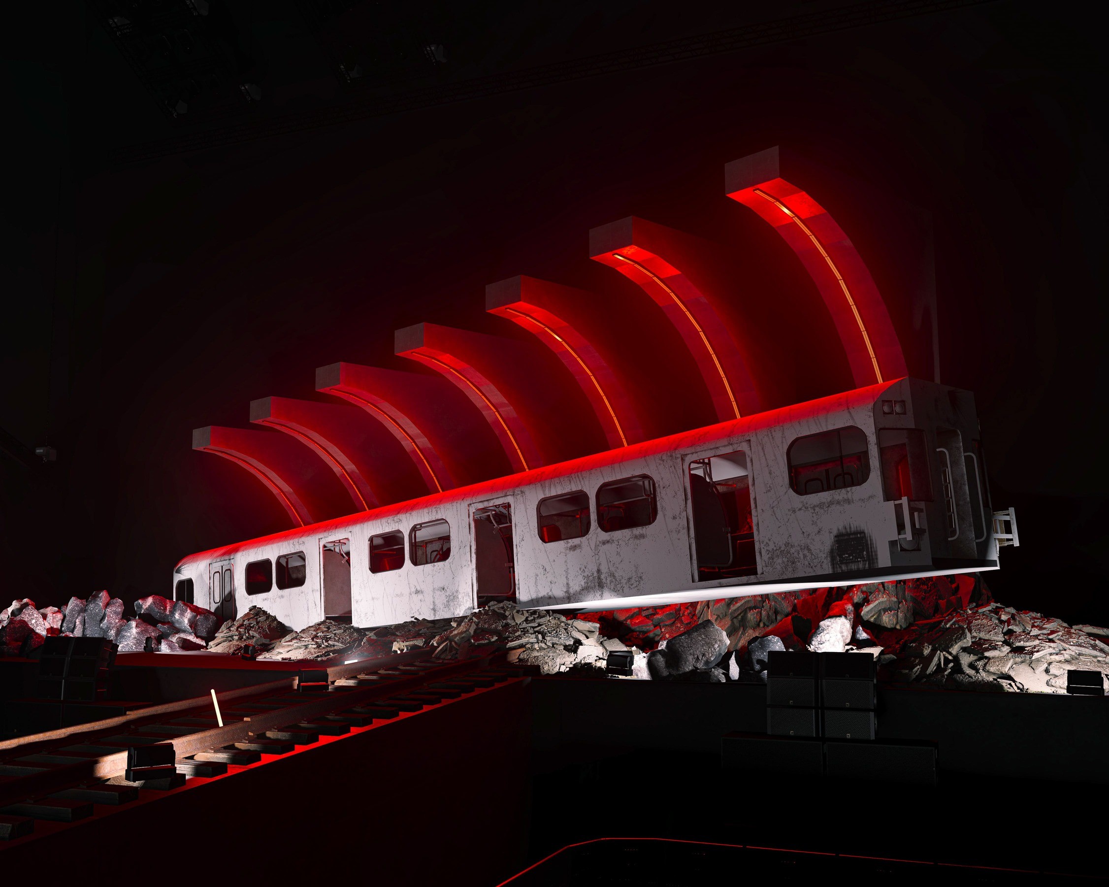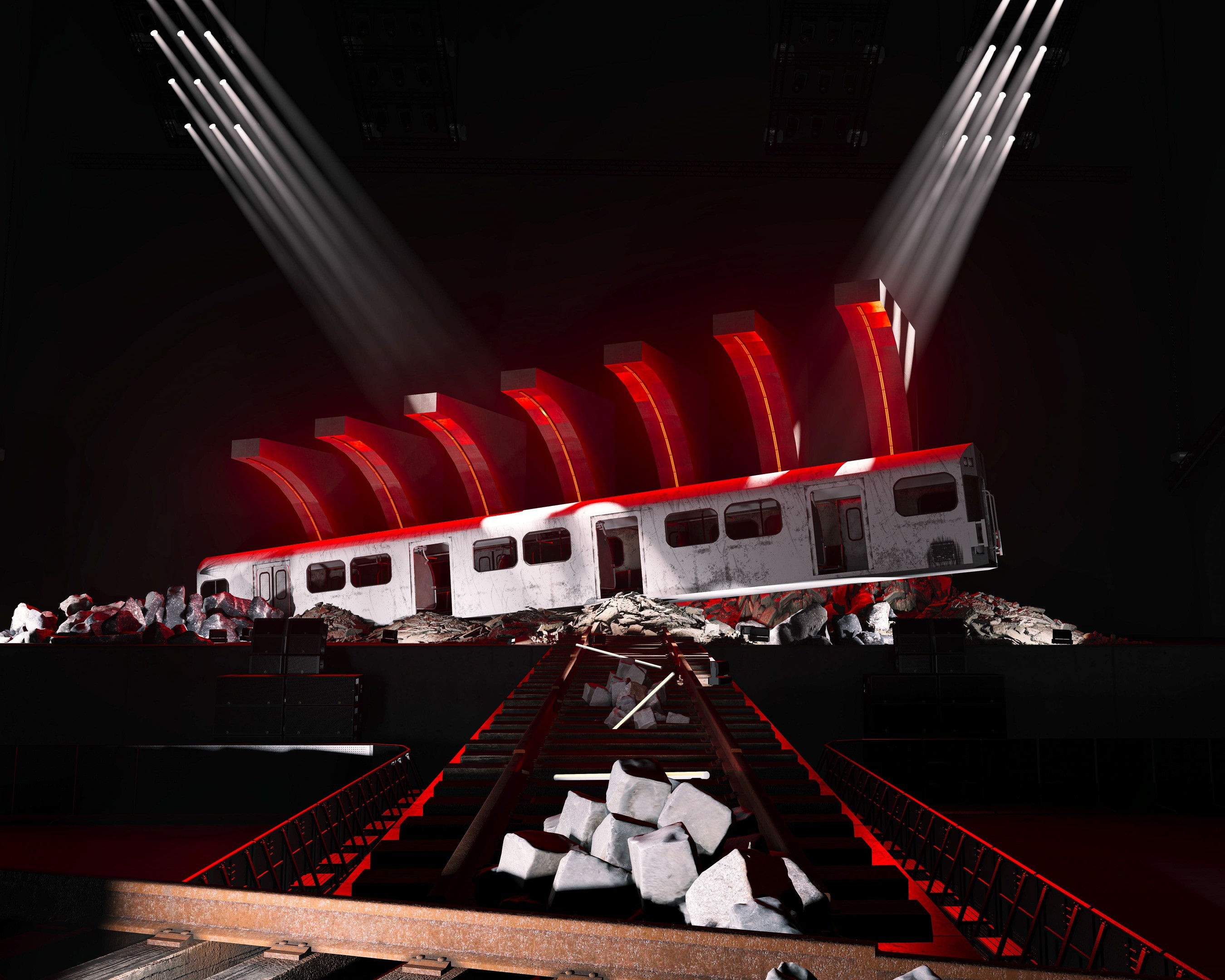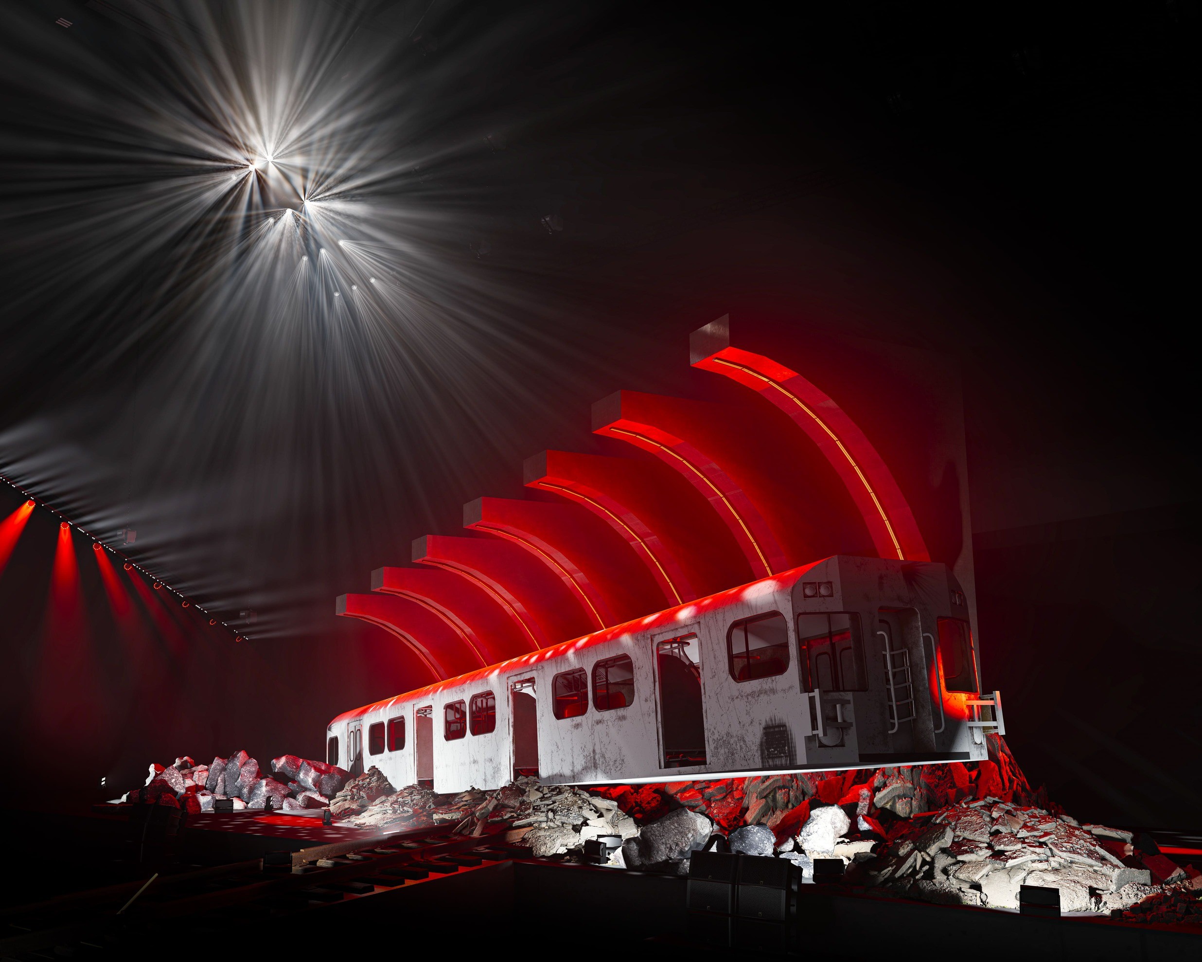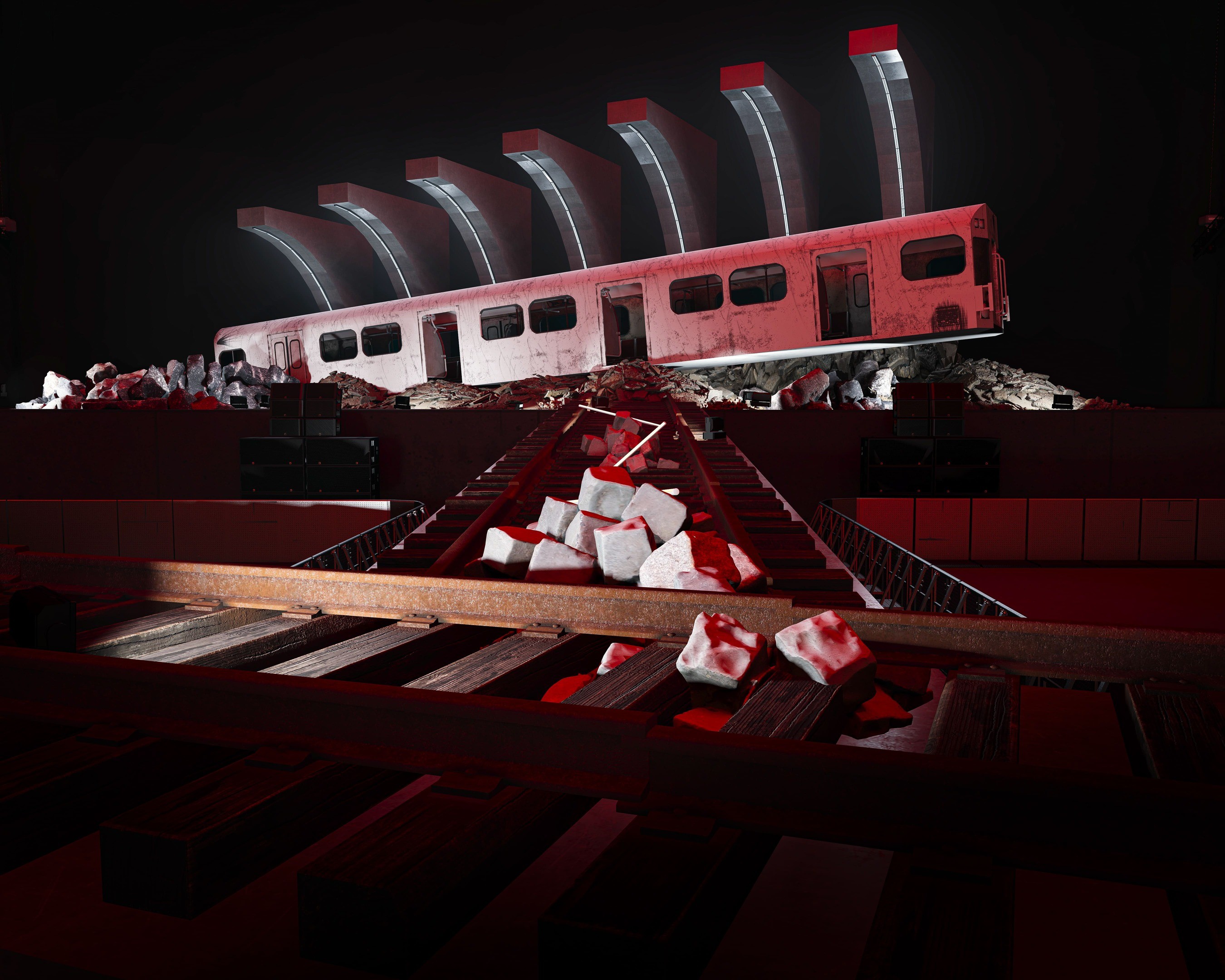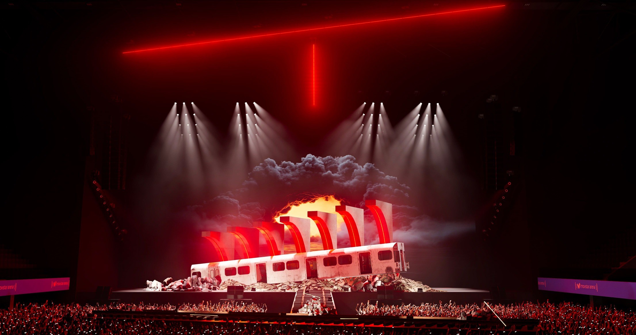 We designed the world tour show by developing an artistic concept centered on a train stopped due to an emergency. The halt symbolizes the passage of time and the need to pause and reflect. The scenography recreates an industrial tunnel with beams and rails that surround both the artist and the audience. The lighting emphasizes the tunnel’s architecture and draws vanishing lines along the rails, guiding the visual narrative song by song. A rear screen creates depth, extends the tunnel space, and amplifies the sense of movement. The result is a show with its own identity, where scenography, lighting, and visuals work together to build an immersive and cinematic experience.