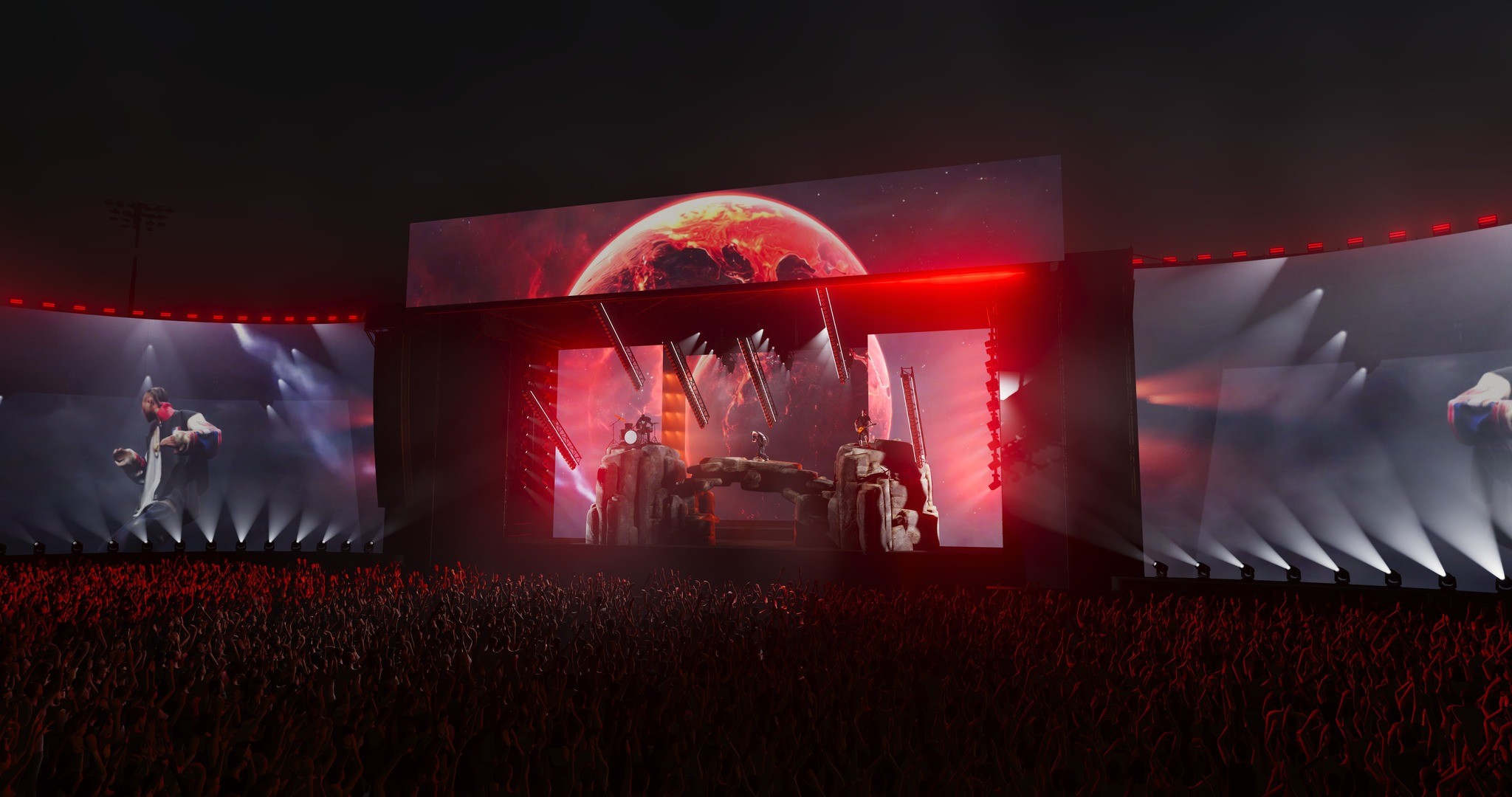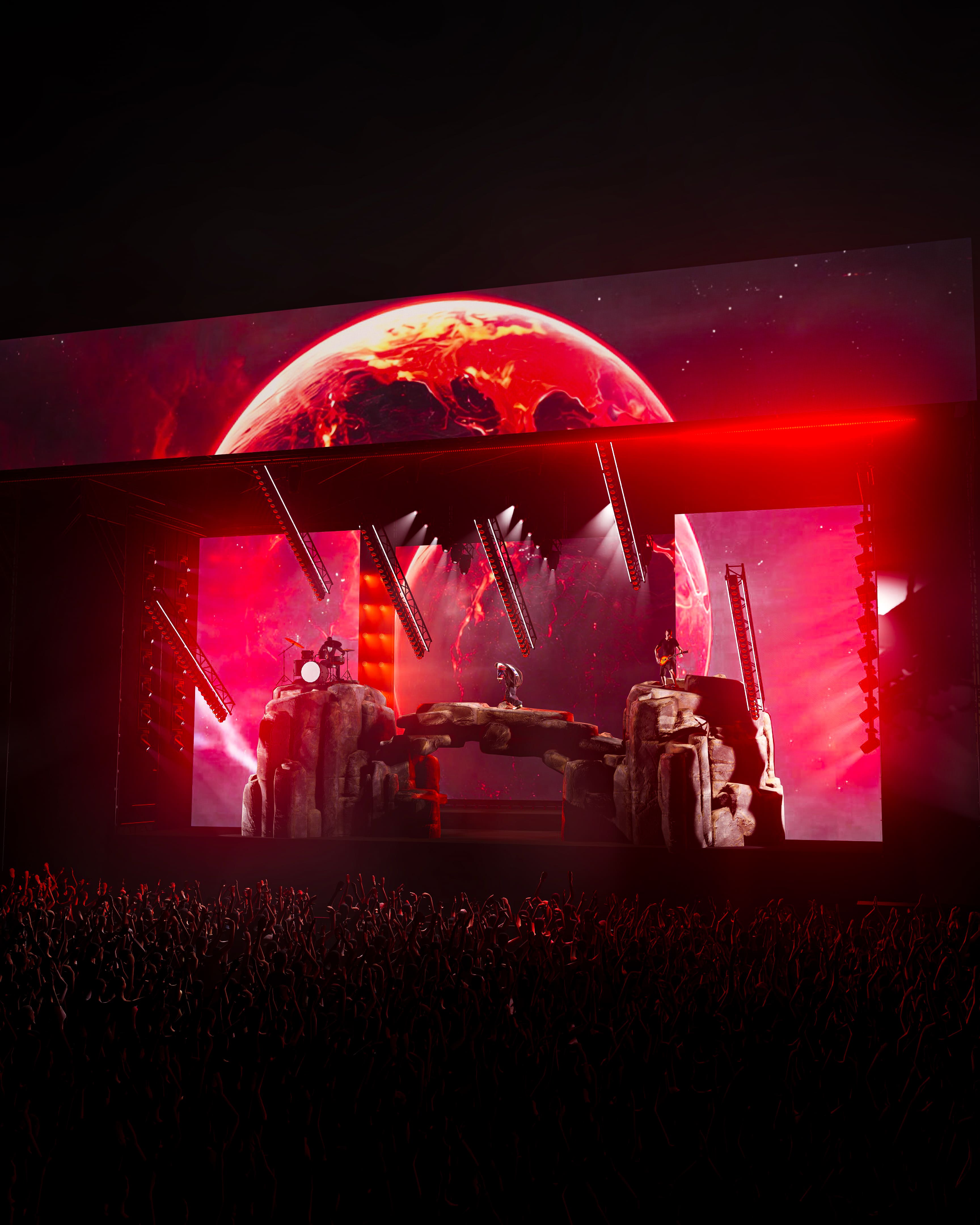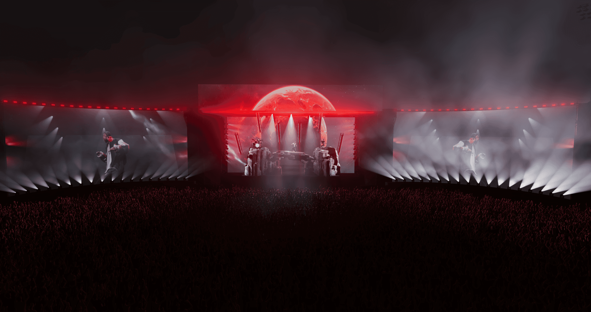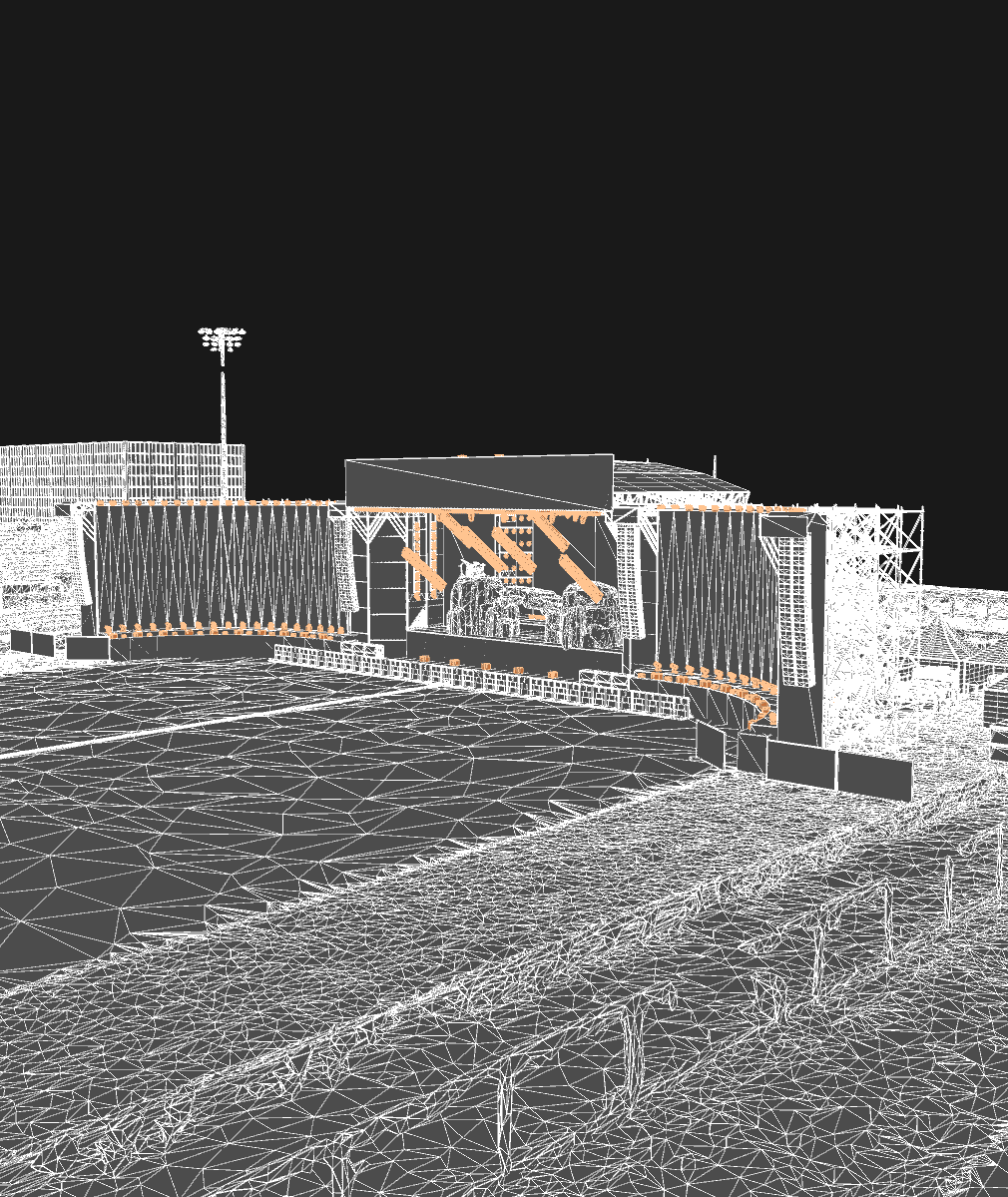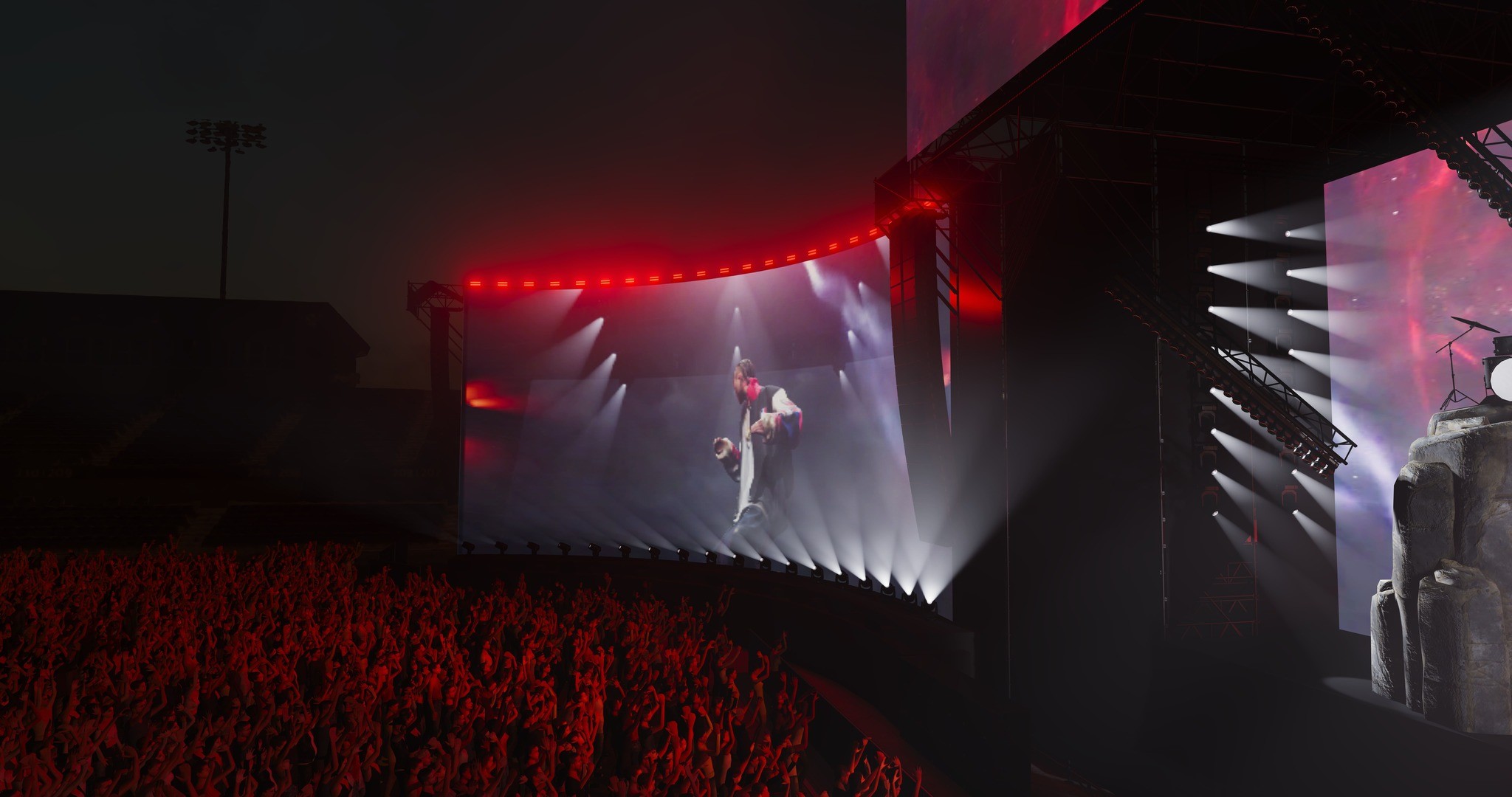 We handled the artistic conceptualization and the stage design for a festival, creating an immersive approach through curved screens that extend in a semi-circular shape toward the audience, combined with a striking scenography where the artist performs. Additionally, variable-speed motors were integrated to shape different lighting atmospheres throughout the show.