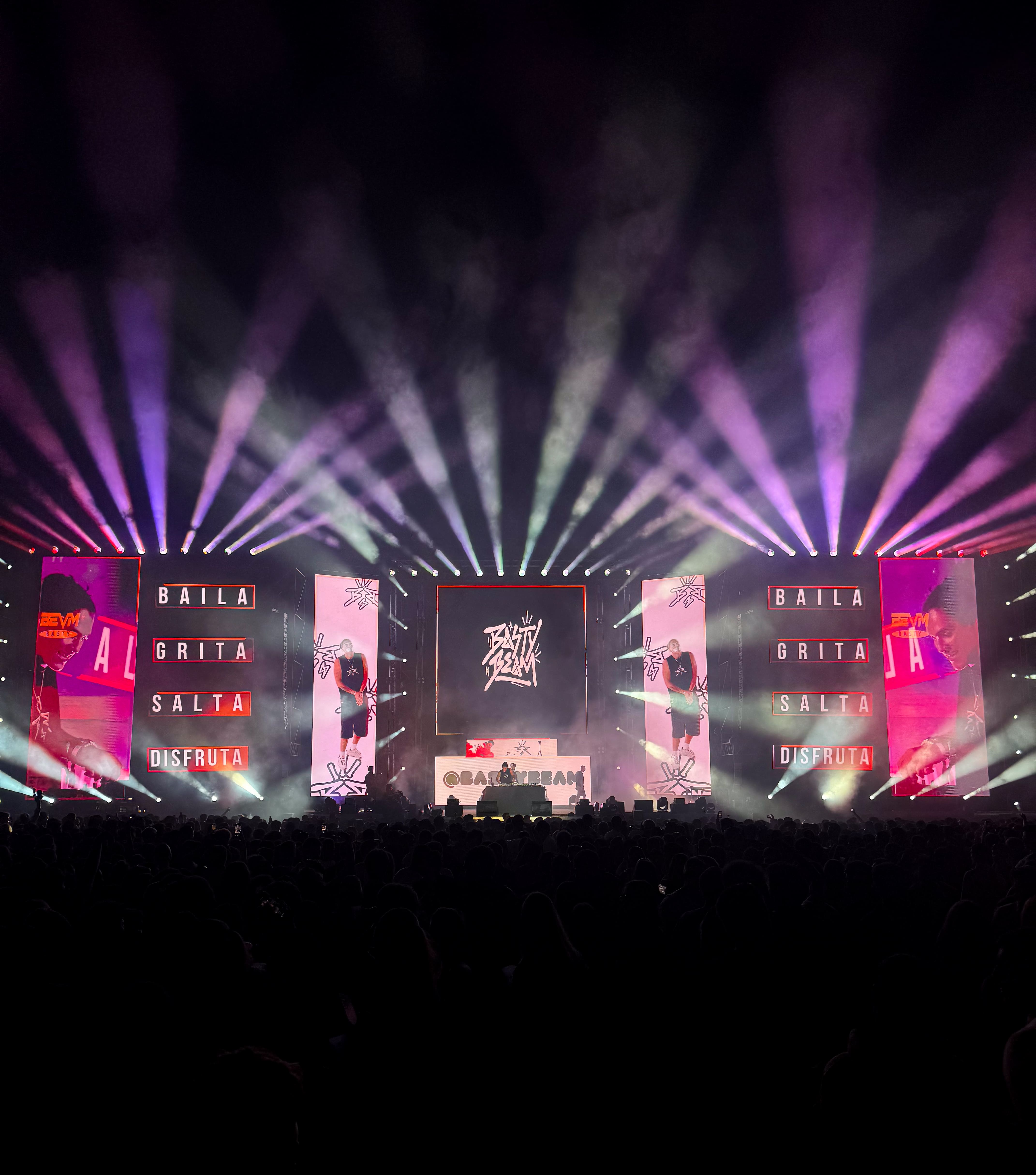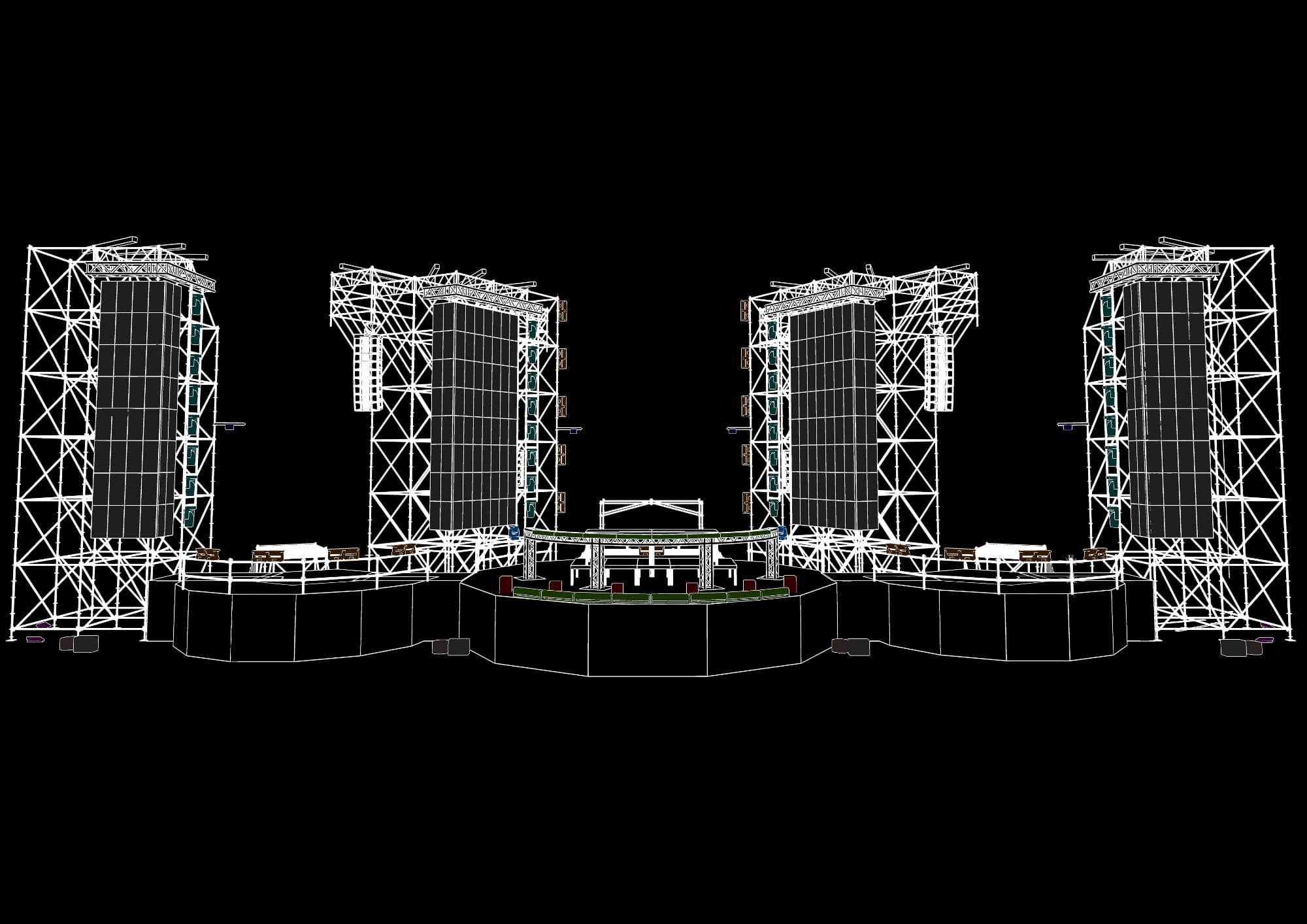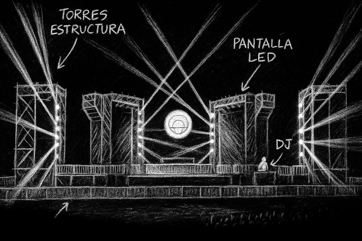 Desarrollamos el diseño completo del escenario, incluyendo las estructuras, la escenografía, la iluminación, las pantallas, los láseres y los efectos especiales. Todo pensado como un conjunto integrado que combine impacto visual con viabilidad técnica.