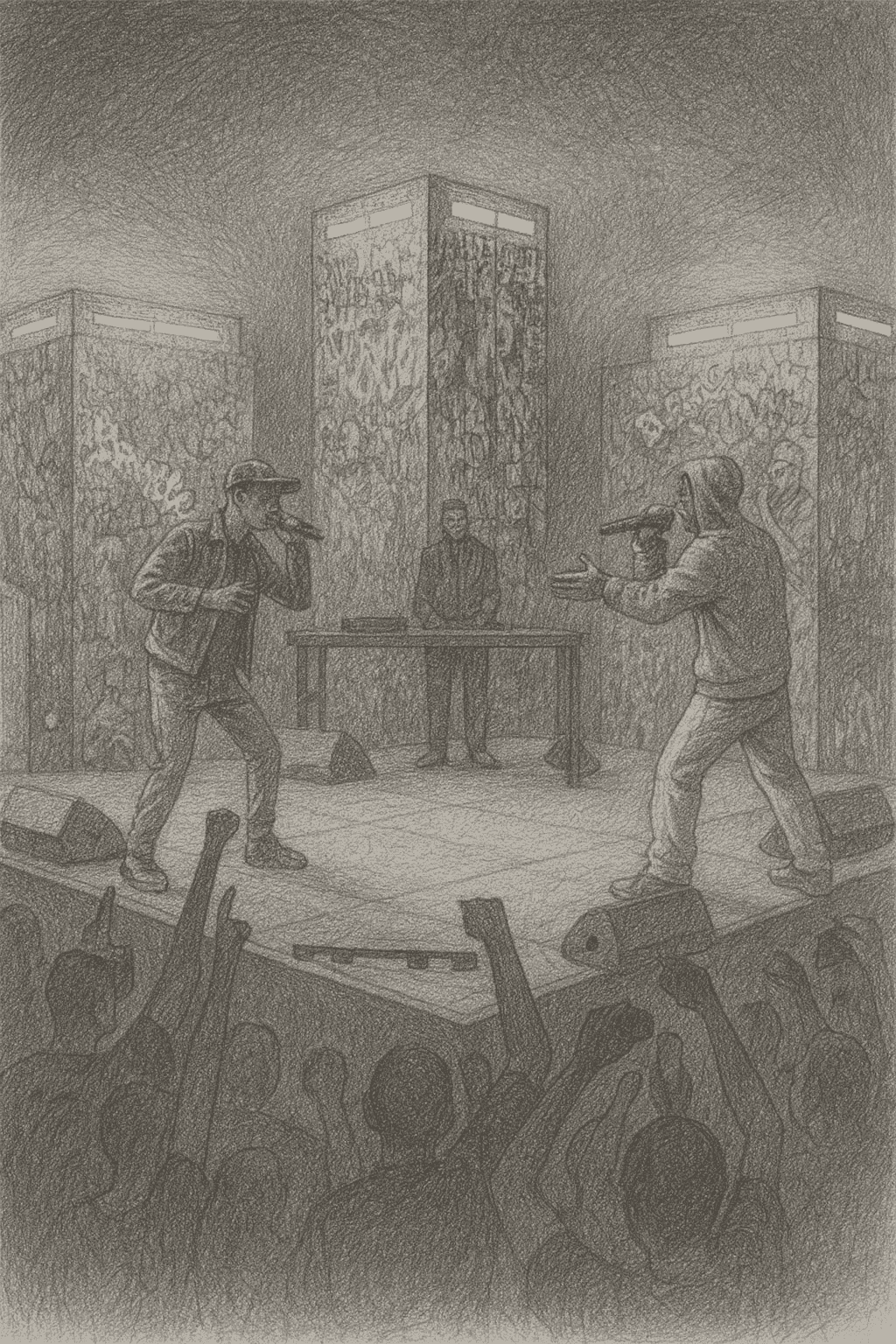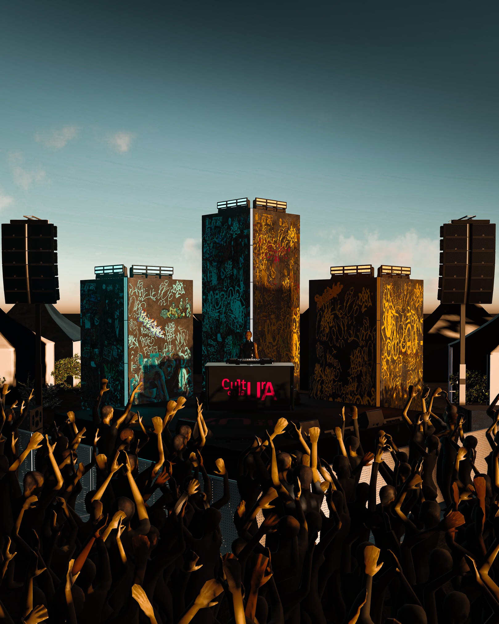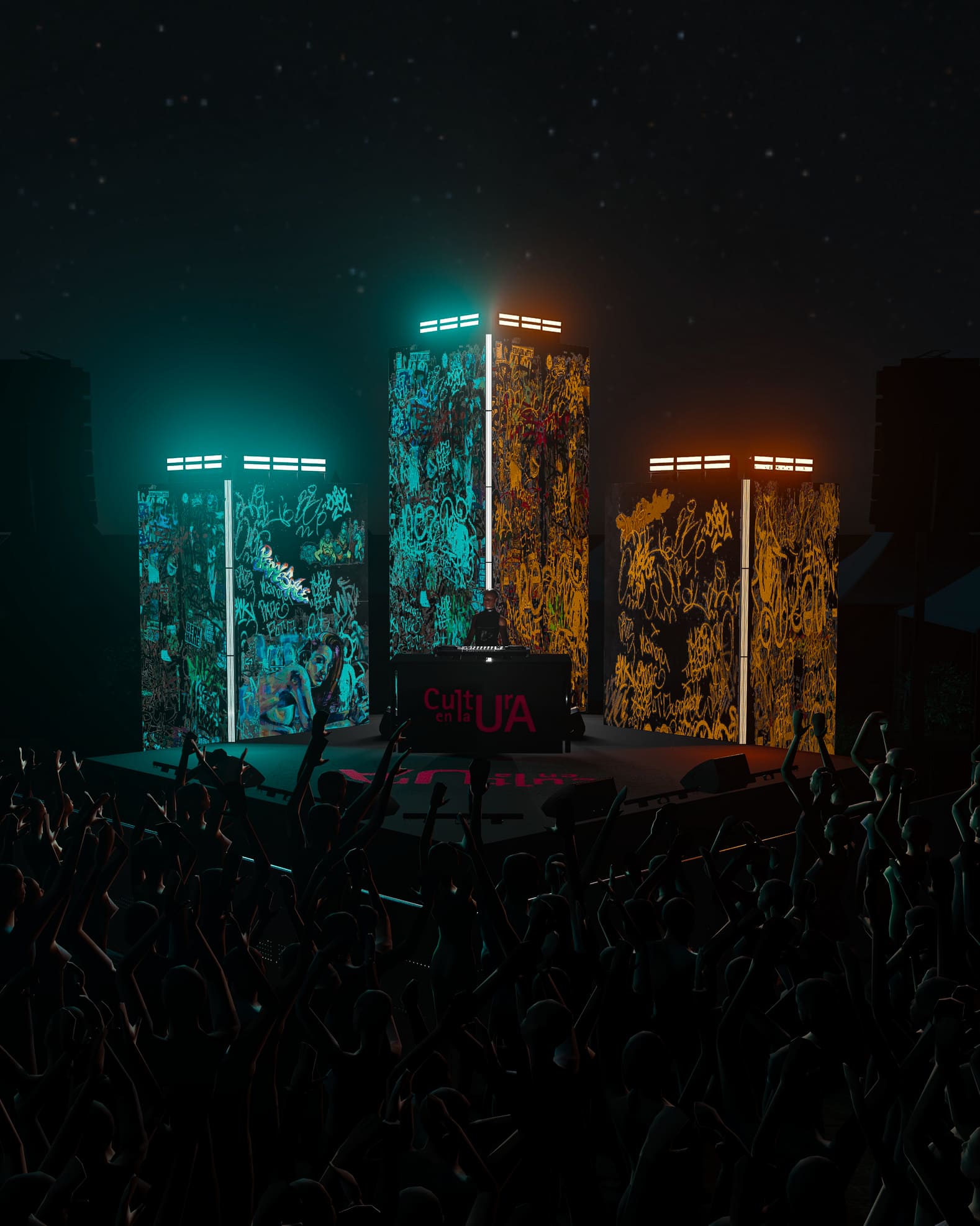 Desarrollamos el diseño conceptual y visual del Escenario 4 para el festival Rocanrola, inspirado en una batalla de gallos 1vs1, representando la dualidad entre dos fuerzas opuestas con los colores cyan y naranja. El diseño incorpora tres torres de iluminación y una decoración viva de grafitis creados por los propios asistentes, convirtiéndolos en parte activa de la experiencia inmersiva.