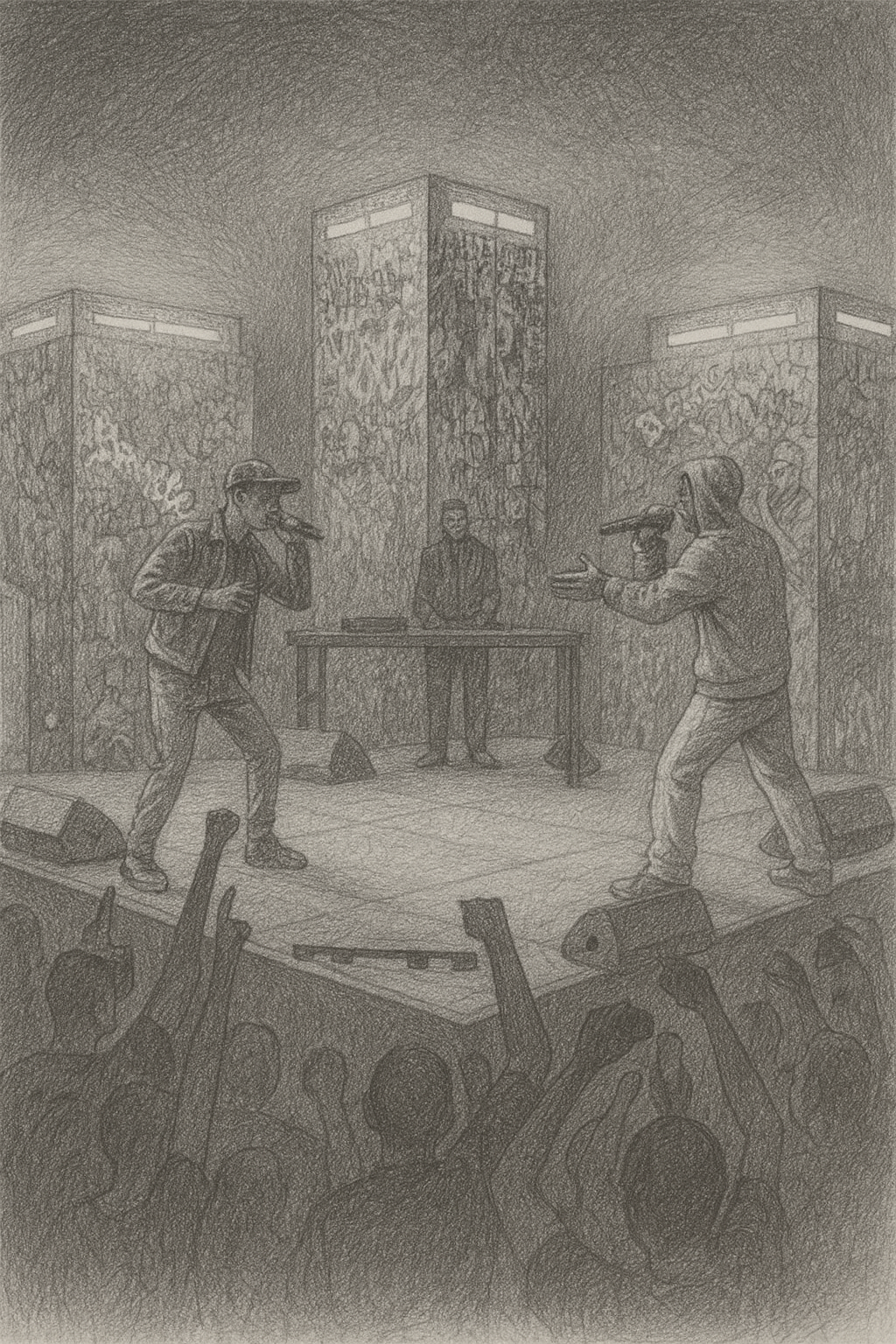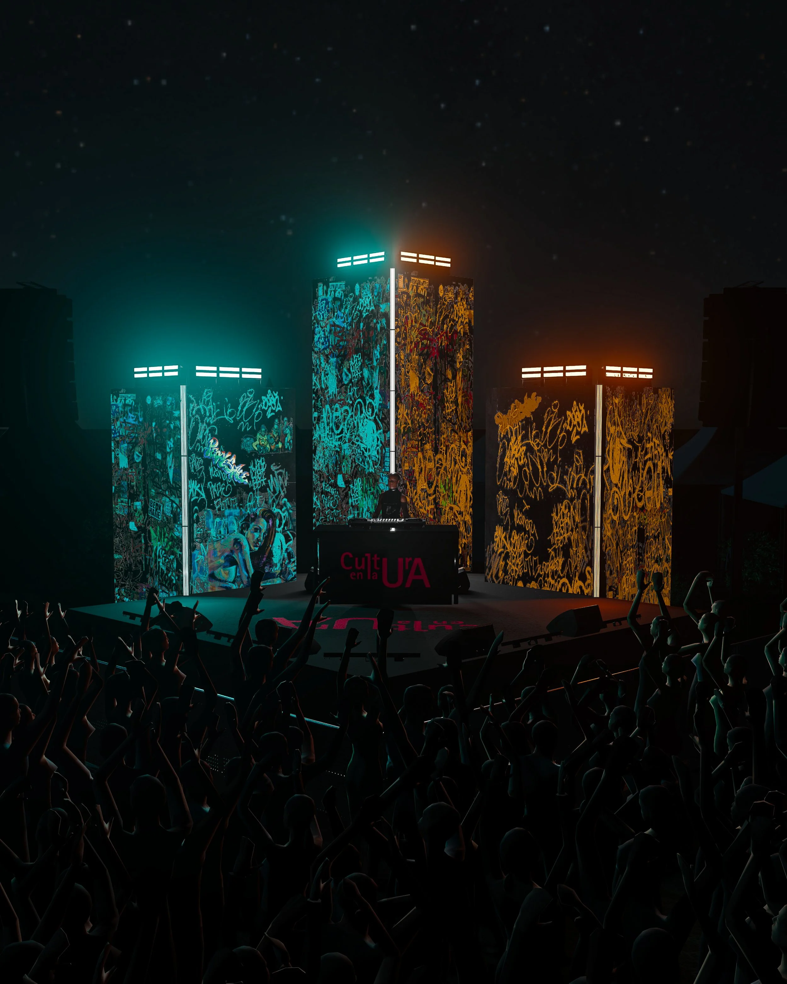 Desarrollamos el diseño conceptual y visual del Escenario 4 para el festival Rocanrola, inspirado en una batalla de gallos 1vs1, representando la dualidad entre dos fuerzas opuestas con los colores cyan y naranja. El diseño incorpora tres torres de iluminación y una decoración viva de grafitis creados por los propios asistentes, convirtiéndolos en parte activa de la experiencia inmersiva.